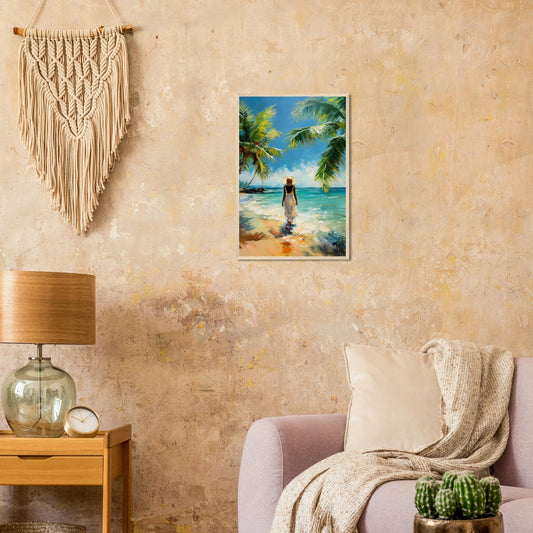 Girl Walking on the Beach Framed Poster – Coastal Art with Palm Trees and Blue Sea
