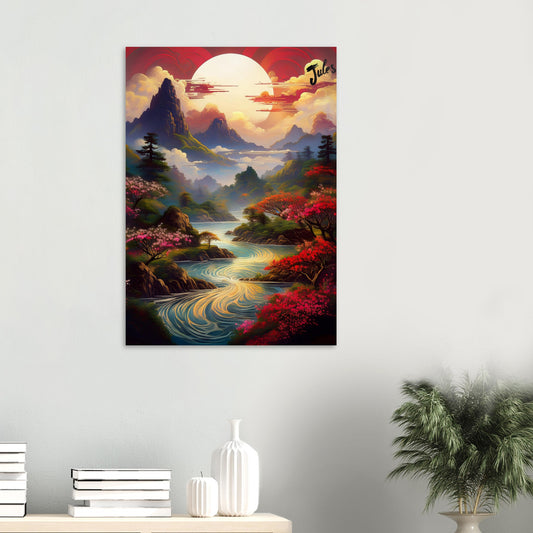Traditional Chinese Landscape Poster – Vibrant Trees & Waterfalls Design