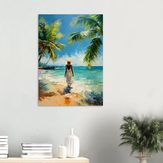 Coastal Sunset Poster – Girl Walking on the Beach with Palm Trees & Blue Sea