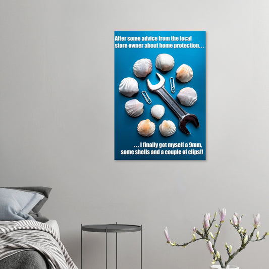 Funny Home Protection Poster – Unique Design with 9mm, Shells, and Clips