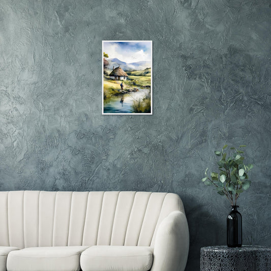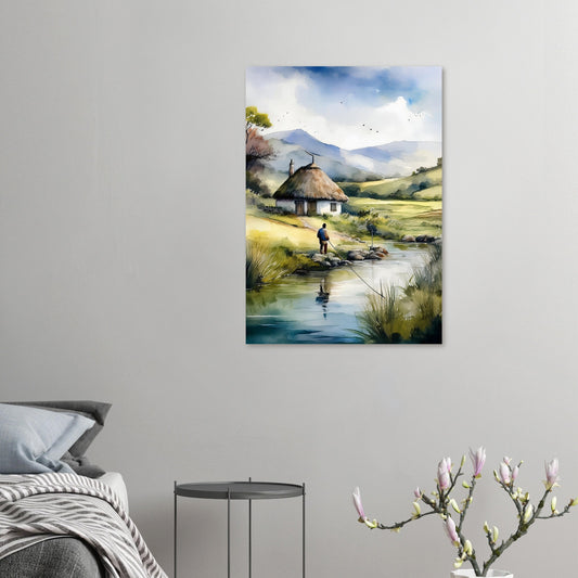 Watercolour Fishing Print Poster – Serene Cottage River Scene Art
