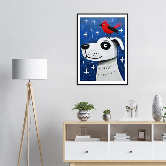 Colourful Framed Poster – White Dog with Red Bird | Humorous Art