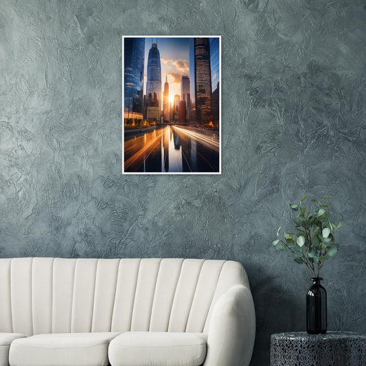 Cityscape Sunrise Mount Framed Poster – Stunning Reflections in Skyscrapers