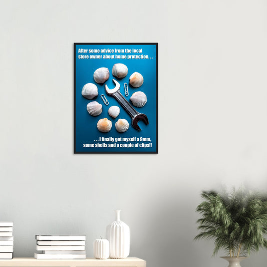 Funny Home Protection Poster – Unique Design with 9mm, Shells, and Clips