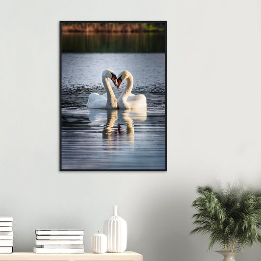 Elegance in Nature Mounted Framed Poster – Heart-Shaped Swans on Lake