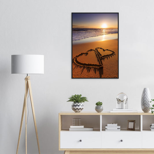 Romantic Beach Sunset Framed Poster – Two Hearts in the Sand Gift for Valentine's Day