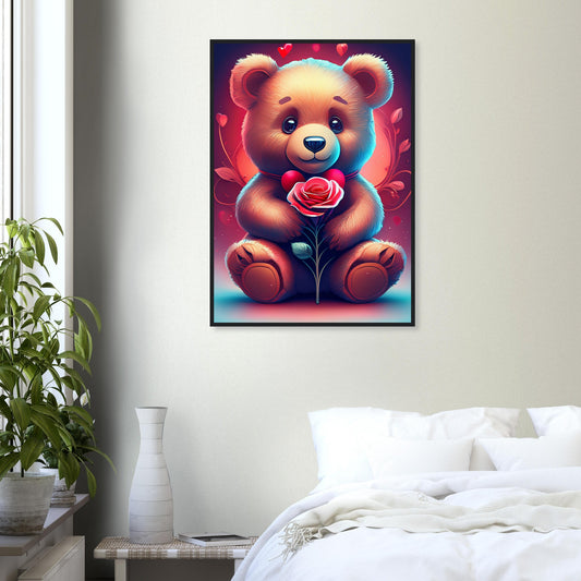 Valentine Bear and Rose Mounted Framed Poster – Cute Teddy Bear Wall Art