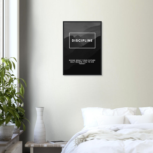 Póster enmarcado con diseño de disciplina motivacional en blanco y negro