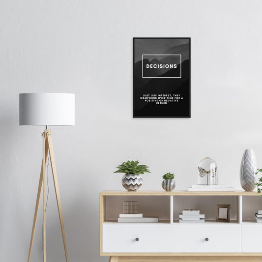 Póster motivacional empresarial Decisiones: arte mural enmarcado en blanco y negro