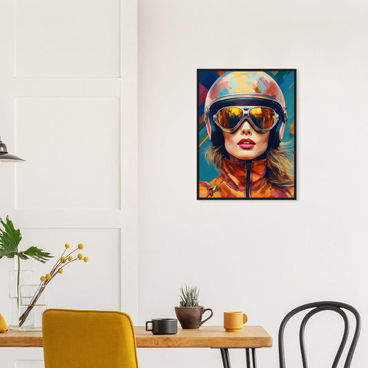 Impresión enmarcada con retrato de una chica de moda con chaqueta de cuero: diseño de casco de motocicleta retro