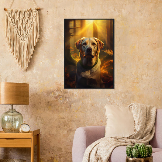 Póster enmarcado con retrato de perro labrador: decoración del amanecer en el bosque