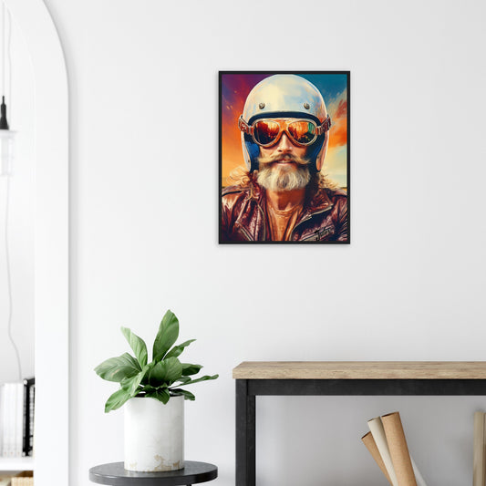 Impresión enmarcada con retrato de un motociclista retro: diseño divertido con barba y casco