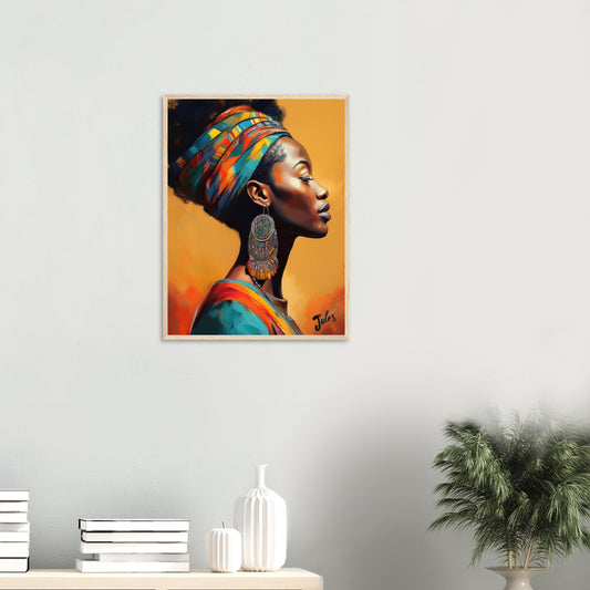 Elegante impresión enmarcada: retrato de una bella mujer africana negra con un tocado colorido