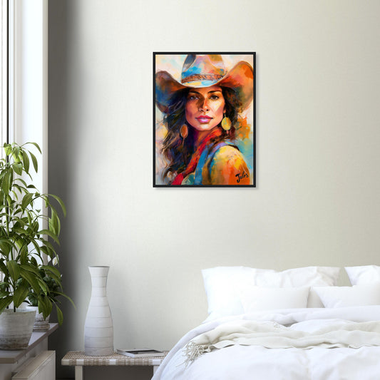 Impresión enmarcada con retrato de vaquera moderno y colorido: decoración elegante para el hogar