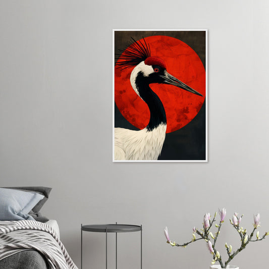 Asian Style Red Crowned Crane Mounted Framed Poster – Elegant Bird Art Decor