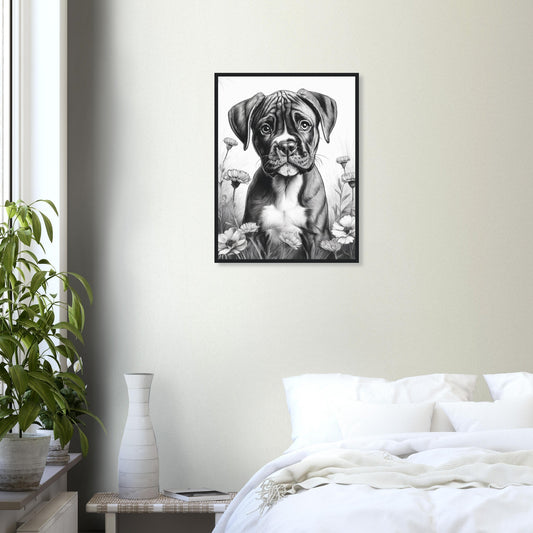 Affiche encadrée chiot Boxer – Illustration de chien en noir et blanc