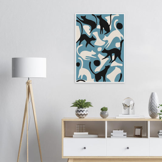Abstract Cats Mounted Framed Poster – Black, White & Blue Design