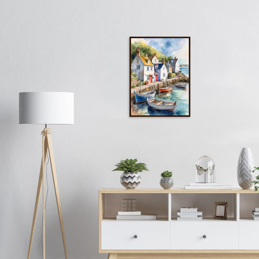 Magnifique affiche encadrée représentant un village de pêcheurs à l'aquarelle – Bateaux colorés et cottages pittoresques